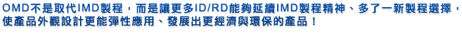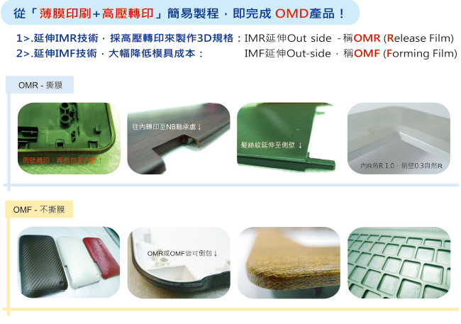 Out-side Mold Decoration,OMD 模外裝飾,也稱「高壓轉印」 將圖案文字印刷於透明薄膜後,採用高壓、真空轉印直接將圖文披覆於 塑膠表面形成「立體塗裝」之新技術; 此技術近日最吸睛的是將圖文(例如仿金屬髮絲等)立體轉寫、加飾於『金屬/鎂鋁或3D玻璃/碳玻纖』外殼 上,讓 金屬/鎂鋁或3D玻璃/碳玻纖 表面處理多一種外觀製程選擇。 另一種OMD功能也可以將「異材質」材料(如薄膜、皮革、木飾等)經由OMD設備 的高壓、真空成型披覆於塑膠(或金屬)外層,過程只需開立「一般射出模具」、不須再開立 IMF特殊模具,甚至於還可以省略以往的「IMF高壓模具」,足足節省模具成本40~50%!